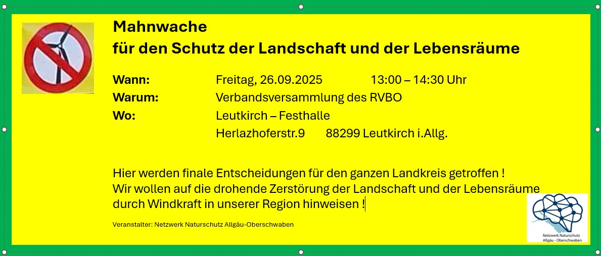 WOLFEGG – Mit Bannern wie „Windräder gefährden das Grundwasser“, „Windräder trocknen Wälder aus“, „Adel verpflichtet – Windkraft vernichtet das Europadiplom“, „Für den Erhalt unserer Natur“ wurden die Kreistagsmitglieder bei ihrer Sitzung in Wolfegg empfangen. Die friedliche Mahnwache, zu der das Netzwerk Naturschutz Allgäu-Oberschwaben aufgerufen hatte, folgten rund 200 Freunde und Mitglieder von 17 Bürgerinitiativen mit mehr als 2.100 Mitgliedern aus dem Netzwerk.